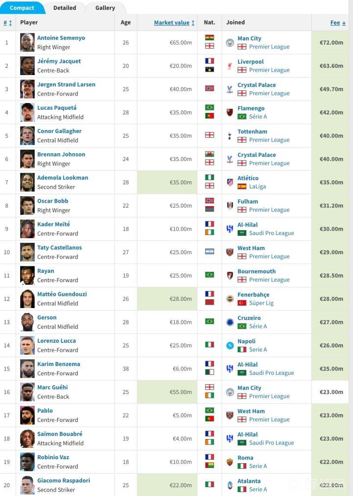 冬窗转会榜:塞门约7200万欧标王,雅凯6360万欧次席