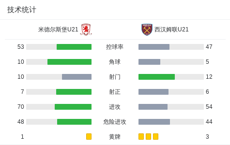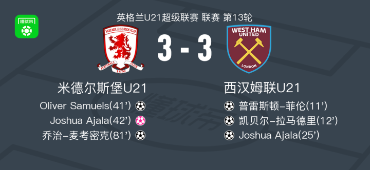 北京时间2月3日英格兰U21超级联赛 联赛 第13轮,米德尔斯堡U21主场对阵西汉姆联U21。米德尔斯堡U21Oliver Samuels破门,乔治-麦考密克破门。西汉姆联U21普雷斯顿-菲伦破门,凯贝尔-拉马德里破门,Joshua Ajala破门,Joshua Ajala自摆乌龙。最终比分米德尔斯堡U21 3-3 西汉姆联U21。