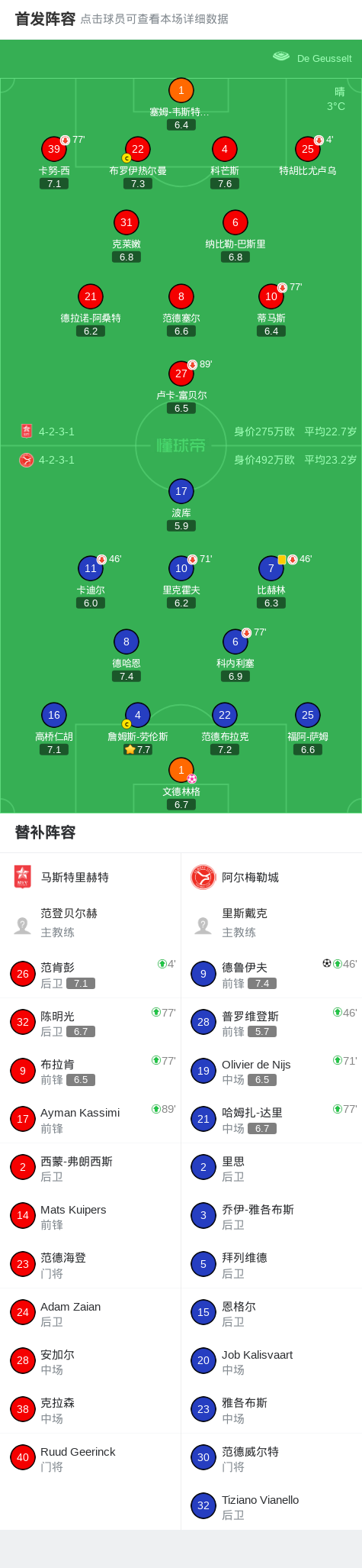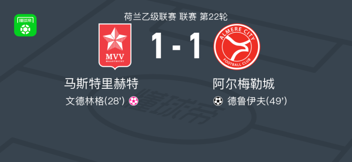 北京时间2月3日荷兰乙级联赛 联赛 第22轮,马斯特里赫特主场对阵阿尔梅勒城。阿尔梅勒城德鲁伊夫破门,文德林格自摆乌龙。最终比分马斯特里赫特 1-1 阿尔梅勒城。