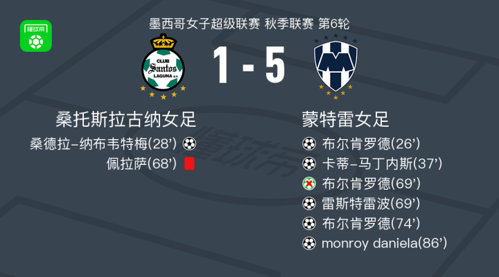 北京时间2月3日墨西哥女子超级联赛 秋季联赛 第6轮,桑托斯拉古纳女足主场对阵蒙特雷女足。桑托斯拉古纳女足桑德拉-纳布韦特梅破门。蒙特雷女足布尔肯罗德梅开二度,卡蒂-马丁内斯破门,雷斯特雷波破门,monroy daniela破门。最终比分拉古纳女足 1-5 蒙特雷女足。