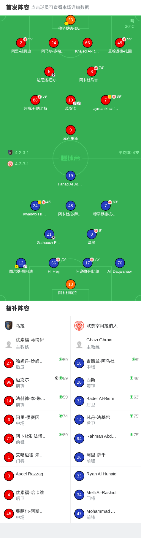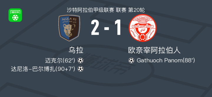 北京时间2月3日沙特阿拉伯甲级联赛 联赛 第20轮,乌拉主场对阵欧奈宰阿拉伯人。乌拉迈克尔破门,达尼洛-巴尔博扎破门。欧奈宰阿拉伯人Gathuoch Panom破门。最终比分乌拉 2-1 欧奈宰阿拉伯人。