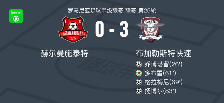 北京时间2月4日罗马尼亚足球甲级联赛 联赛 第25轮,赫尔曼施泰特主场对阵布加勒斯特快速。布加勒斯特快速乔博塔留破门,格拉梅尼破门,扬博尔破门。最终比分赫尔曼施泰特 0-3 布加勒斯特快速。