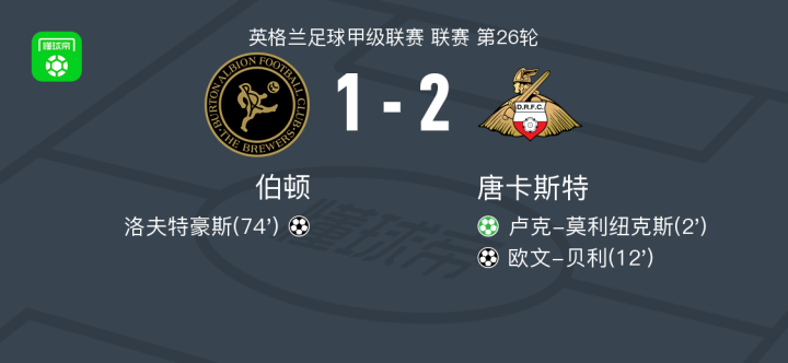 北京时间2月4日英格兰足球甲级联赛 联赛 第26轮,伯顿主场对阵唐卡斯特。伯顿洛夫特豪斯破门。唐卡斯特卢克-莫利纽克斯破门,欧文-贝利破门。最终比分伯顿 1-2 唐卡斯特。