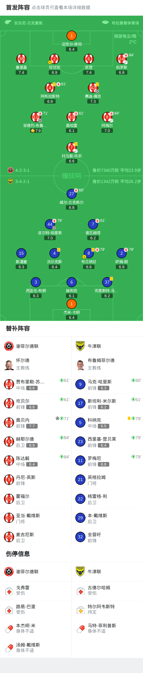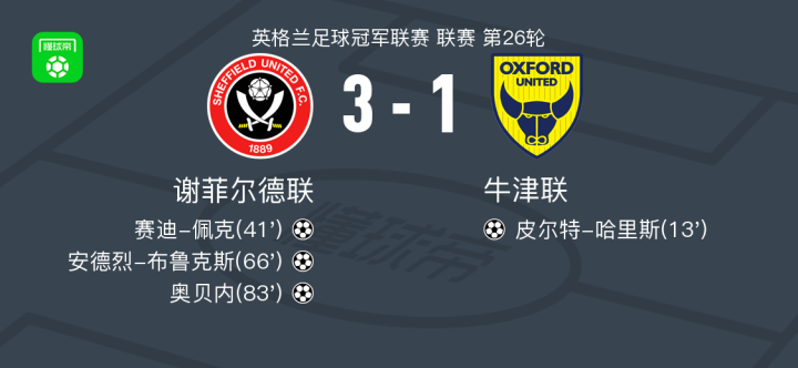 北京时间2月4日英格兰足球冠军联赛 联赛 第26轮,谢菲尔德联主场对阵牛津联。谢菲尔德联赛迪-佩克破门,安德烈-布鲁克斯破门,奥贝内破门。牛津联皮尔特-哈里斯破门。最终比分谢菲尔德联 3-1 牛津联。