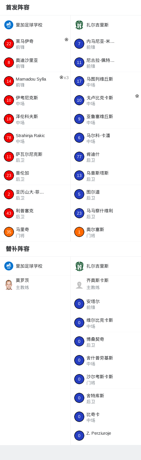北京时间2月4日俱乐部友谊赛,里加足球学校对阵扎尔吉里斯。里加足球学校Mamadou Sylla帽子戏法,莱马伊奇破门。扎尔吉里斯戈卢比克卡斯破门。最终比分里加足球学校 4-2 扎尔吉里斯。