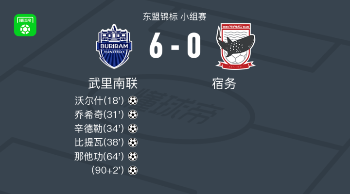 北京时间2月4日东盟锦标 小组赛,武里南联对阵宿务。武里南联沃尔什破门,乔希奇破门,辛德勒破门,比提瓦破门,那他功破门。最终比分武里南联 6-0 宿务。