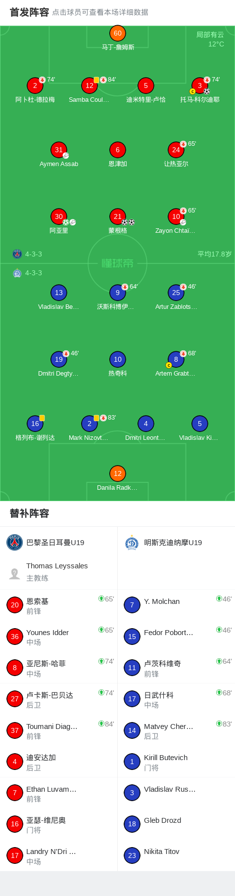 北京时间2月4日欧洲青年联赛 1/16决赛,巴黎圣日耳曼U19对阵明斯克迪纳摩U19。巴黎圣日耳曼U19托马-科尔迪耶破门,蒙根格梅开二度,阿亚里破门。最终比分巴黎圣日耳曼U19 4-0 明斯克迪纳摩U19。
