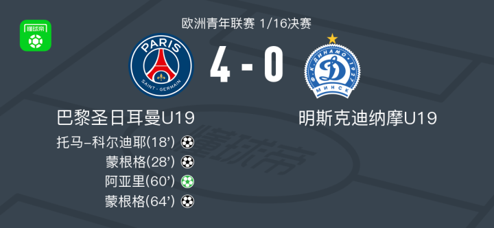 巴黎圣日耳曼U19 4-0大胜明斯克迪纳摩U19,蒙根格两球,阿亚里传射