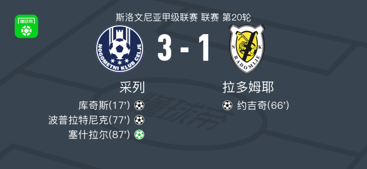 北京时间2月5日斯洛文尼亚甲级联赛 联赛 第20轮,采列主场对阵拉多姆耶。采列库奇斯破门,波普拉特尼克破门,塞什拉尔破门。拉多姆耶约吉奇破门。最终比分采列 3-1 卡尔塞沃多特姆。