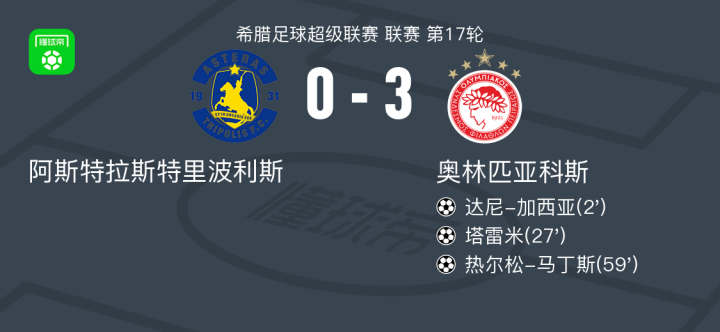 北京时间2月5日希腊足球超级联赛 联赛 第17轮,阿斯特拉斯特里波利斯主场对阵奥林匹亚科斯。奥林匹亚科斯达尼-加西亚破门,塔雷米破门,热尔松-马丁斯破门。最终比分阿斯特拉斯特里波利斯 0-3 奥林匹亚科斯。