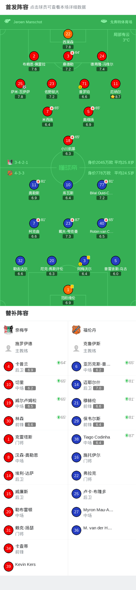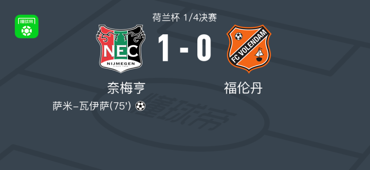 奈梅亨1-0福伦丹,萨米-瓦伊萨一锤定音战报bot @懂球帝02-05 03:40北京时间2月5日荷兰杯 1/4决赛,奈梅亨对阵福伦丹。奈梅亨萨米-瓦伊萨破门。最终比分奈梅亨 1-0 福伦丹。点击查看本场比赛详细数据>>点击查看荷兰杯完整积分榜>>精彩瞬间第75分钟,奈梅亨球员萨米-瓦伊萨打入一球。 球队阵容 技术统计 展开更多