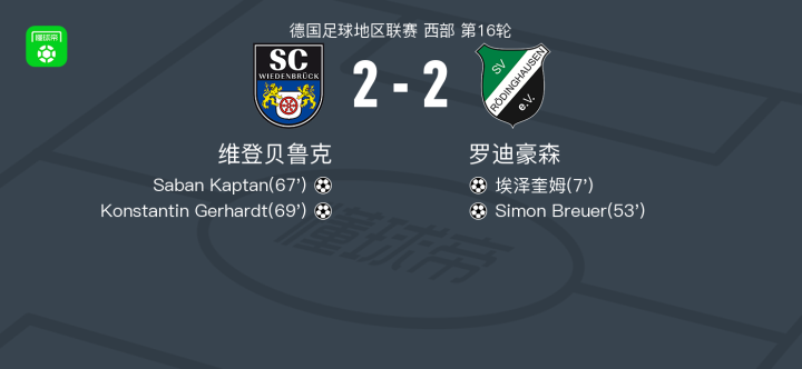 北京时间2月5日德国足球地区联赛 西部 第16轮,维登贝鲁克主场对阵罗迪豪森。维登贝鲁克Saban Kaptan破门,Konstantin Gerhardt破门。罗迪豪森埃泽奎姆破门,Simon Breuer破门。最终比分维登贝鲁克 2-2 罗迪豪森。