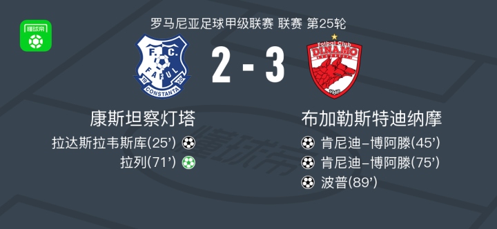 北京时间2月5日罗马尼亚足球甲级联赛 联赛 第25轮,康斯坦察灯塔主场对阵布加勒斯特迪纳摩。康斯坦察灯塔拉达斯拉韦斯库破门,拉列破门。布加勒斯特迪纳摩肯尼迪-博阿滕梅开二度,波普破门。最终比分康斯坦察灯塔 2-3 布加勒斯特迪纳摩。