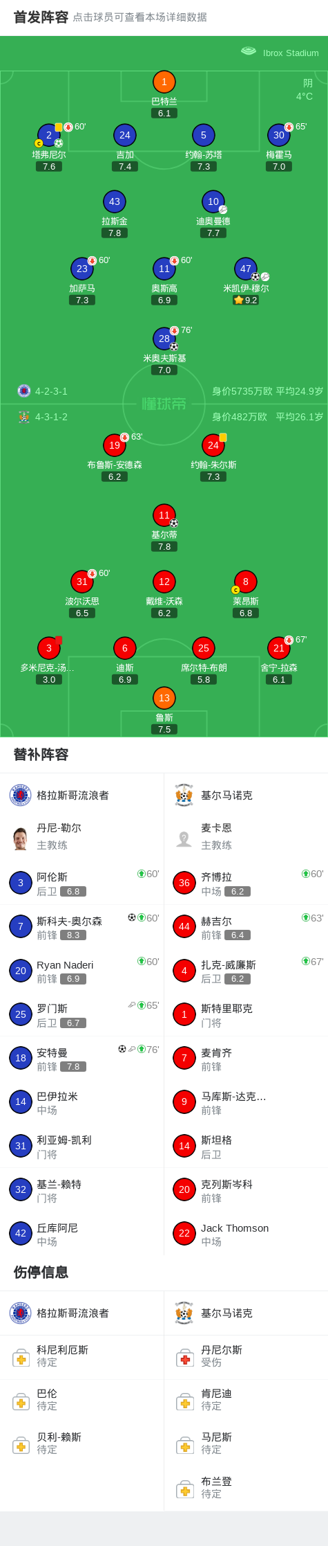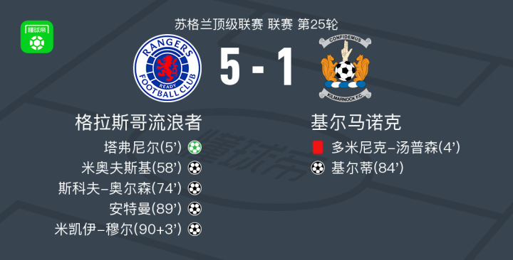 格拉斯哥流浪者5-1大胜基尔马诺克,米凯伊-穆尔传射,安特曼替补1传1射