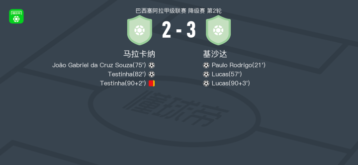 北京时间2月5日巴西塞阿拉甲级联赛 降级赛 第2轮,马拉卡纳主场对阵基沙达。马拉卡纳João Gabriel da Cruz Souza破门,Testinha破门。基沙达Paulo Rodrigo破门,Lucas梅开二度。最终比分马拉卡纳 2-3 基沙达。