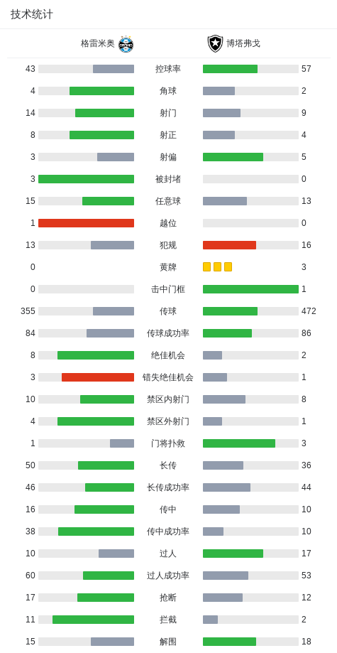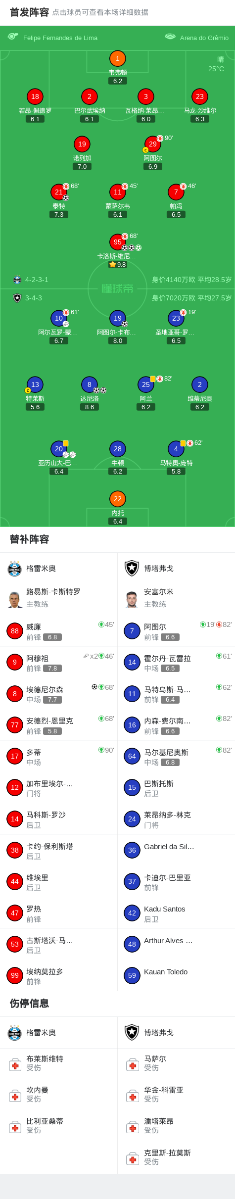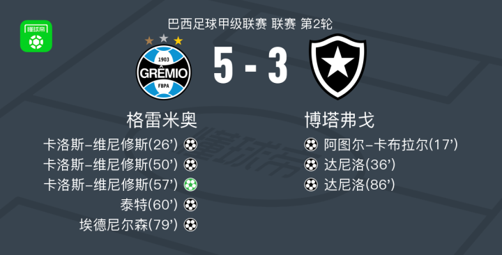 北京时间2月5日巴西足球甲级联赛 联赛 第2轮,格雷米奥主场对阵博塔弗戈。格雷米奥卡洛斯-维尼修斯帽子戏法,泰特破门,埃德尼尔森破门。博塔弗戈阿图尔-卡布拉尔破门,达尼洛梅开二度。最终比分格雷米奥 5-3 博塔弗戈。