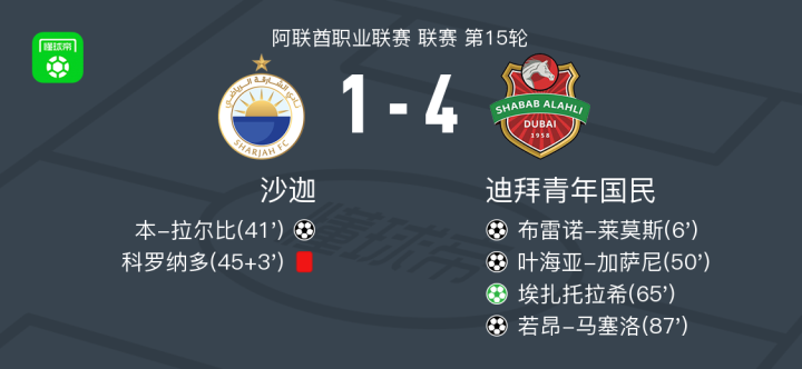 北京时间2月6日阿联酋职业联赛 联赛 第15轮,沙迦主场对阵迪拜青年国民。沙迦本-拉尔比破门。迪拜青年国民布雷诺-莱莫斯破门,叶海亚-加萨尼破门,若昂-马塞洛破门,埃扎托拉希破门。最终比分沙迦 1-4 迪拜青年国民。