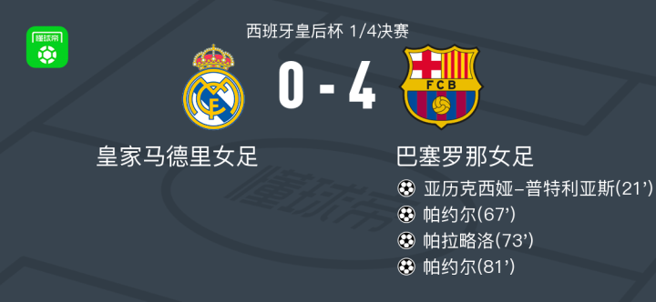 北京时间2月6日西班牙皇后杯 1/4决赛,皇家马德里女足对阵巴塞罗那女足。巴塞罗那女足亚历克西娅-普特利亚斯破门,帕约尔梅开二度,帕拉略洛破门。最终比分皇家马德里女足 0-4 巴塞罗那女足。