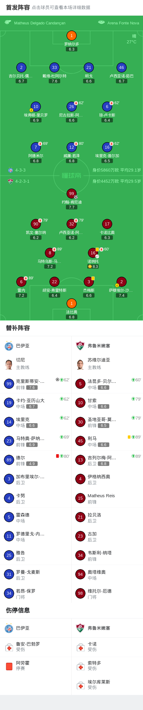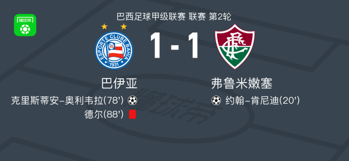 北京时间2月6日巴西足球甲级联赛 联赛 第2轮,巴伊亚主场对阵弗鲁米嫩塞。巴伊亚克里斯蒂安-奥利韦拉破门。弗鲁米嫩塞约翰-肯尼迪破门。最终比分巴伊亚 1-1 弗鲁米嫩塞。