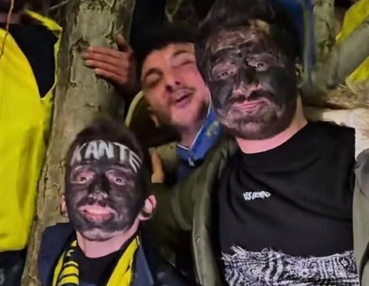 抽象,两名费内巴切球迷欢迎坎特的时候把脸涂成了黑色