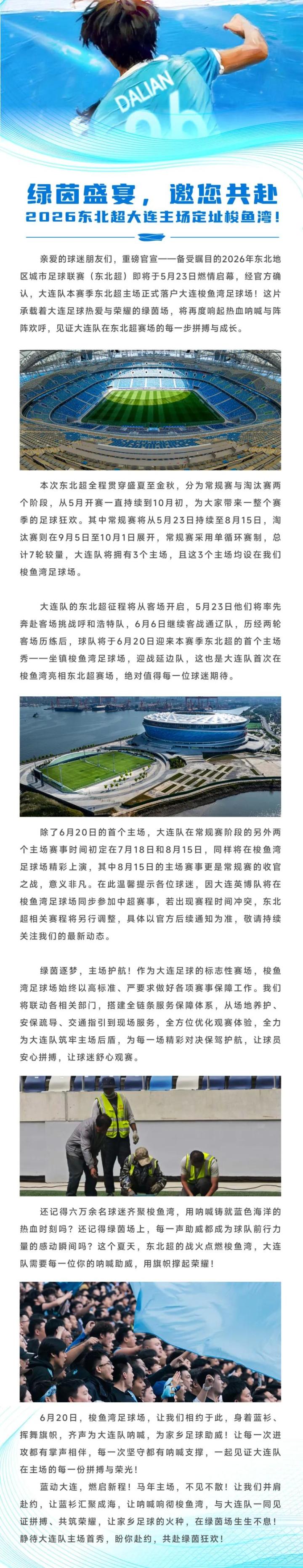 官方:东北超大连队主场落户梭鱼湾,6月20日首个主场战延边盖坦9 @懂球帝02-06 11:55北京时间2月6日,据中升梭鱼湾足球场官方账号的消息,本赛季东北超大连队主场落户梭鱼湾,6月20日首个主场战延边队。本赛季东北超分为常规赛与淘汰赛两个阶段,常规赛将从5月23日持续至8月15日,淘汰赛则是在9月5日至10月1日展开。大连队开赛两连客,5月23日客战呼和浩特队,6月6日客战通辽队,6月20日迎来主场首战,对阵延边队,另外两个主场的时间为7月18日和8月15日。展开更多