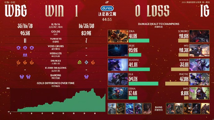 本局WBG在前期迅速滚起优势,虽然WBG经济领先非常多,但是没能迅速结束掉比赛,40分钟后,iG三人想要一波没能成功,WBG打出一换五后一波结束比赛!