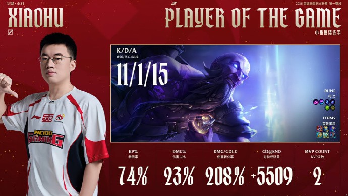 MVP连续第二局给到完美kda的中单Xiaohu!