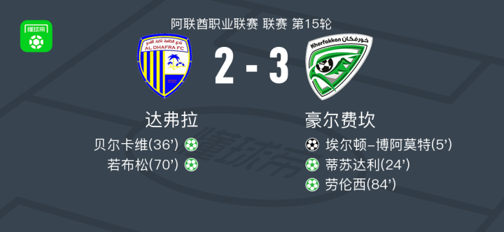 北京时间2月6日阿联酋职业联赛 联赛 第15轮,达弗拉主场对阵豪尔费坎。达弗拉贝尔卡维破门,若布松破门。豪尔费坎埃尔顿-博阿莫特破门,蒂苏达利破门,劳伦西破门。最终比分达弗拉 2-3 豪尔费坎。