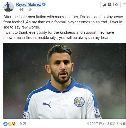 北京时间3月7日早间,莱斯特城边锋马赫雷斯在个人社交媒体宣布由于医疗原因退役。不过马赫雷斯的推特平台并没有发布任何消息,而莱斯特城俱乐部也还尚未作出回应。目前有传言说马赫雷斯的脸书账户被黑,我们也会随时关注事情进展。