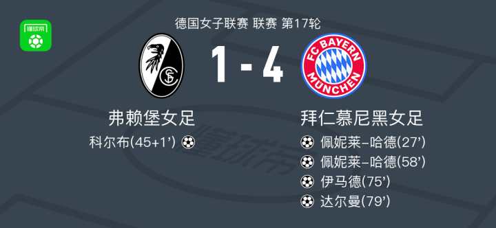 拜仁慕尼黑女足4-1大胜弗赖堡女足,佩妮莱-哈德梅开二度,达尔曼传射