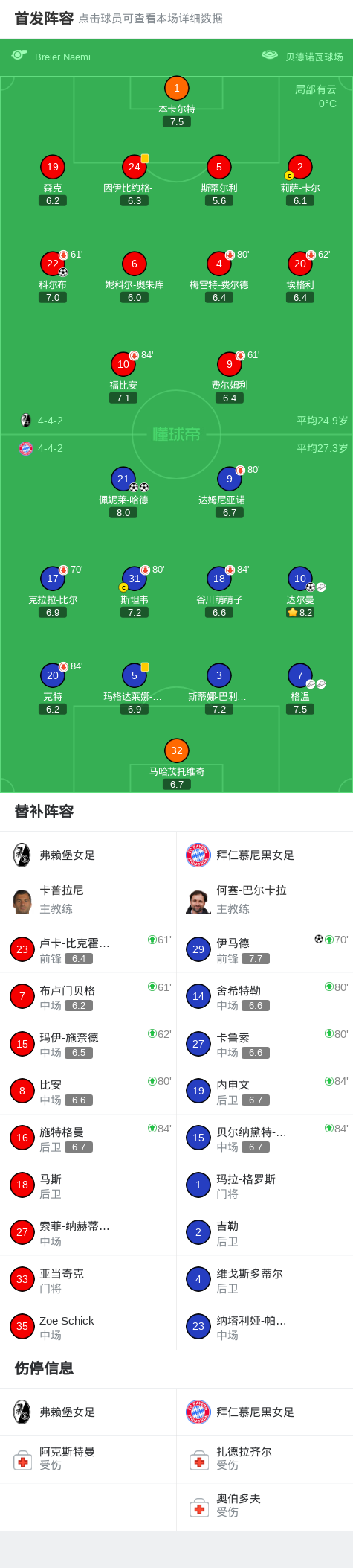 北京时间2月7日德国女子联赛 联赛 第17轮,弗赖堡女足主场对阵拜仁慕尼黑女足。弗赖堡女足科尔布破门。拜仁慕尼黑女足佩妮莱-哈德梅开二度,伊马德破门,达尔曼破门。最终比分弗赖堡女足 1-4 拜仁慕尼黑女足。