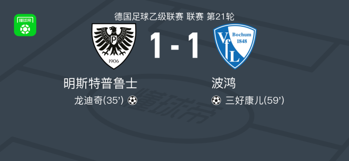 北京时间2月7日德国足球乙级联赛 联赛 第21轮,明斯特普鲁士主场对阵波鸿。明斯特普鲁士龙迪奇破门。波鸿三好康儿破门。最终比分明斯特普鲁士 1-1 波鸿。