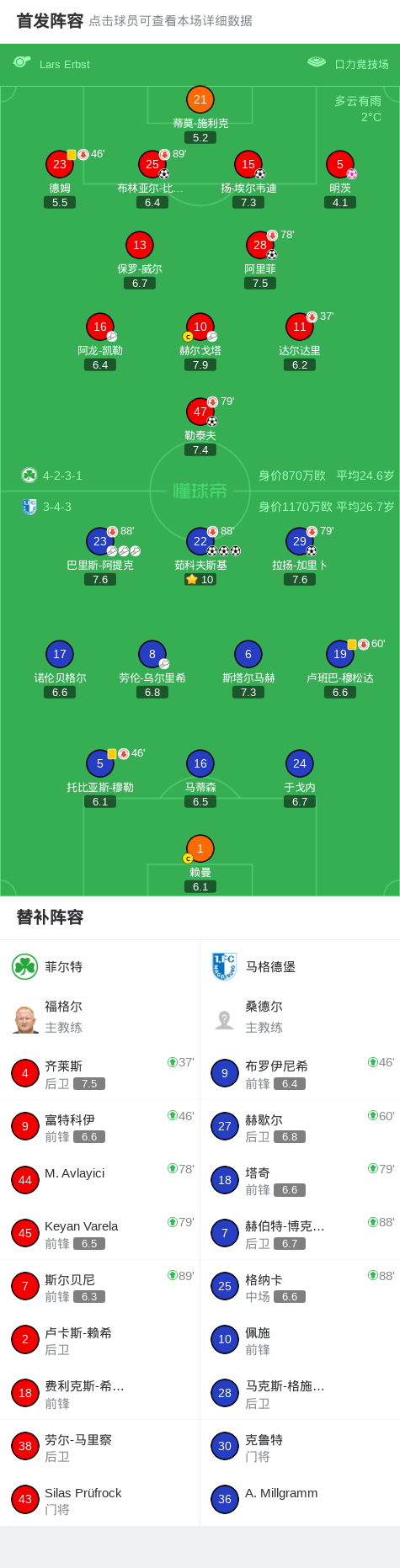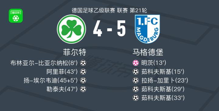 北京时间2月7日德国足球乙级联赛 联赛 第21轮,菲尔特主场对阵马格德堡。菲尔特布林亚尔-比亚尔纳松破门,阿里菲破门,扬-埃尔韦迪破门,勒泰夫破门,明茨自摆乌龙。马格德堡茹科夫斯基帽子戏法,拉扬-加里卜破门。最终比分菲尔特 4-5 马格德堡。