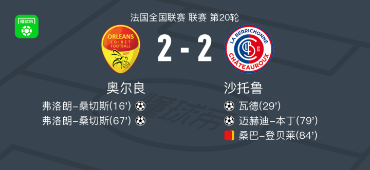 北京时间2月7日法国全国联赛 联赛 第20轮,奥尔良主场对阵沙托鲁。奥尔良弗洛朗-桑切斯梅开二度。沙托鲁瓦德破门,迈赫迪-本丁破门。最终比分奥尔良 2-2 沙托鲁。