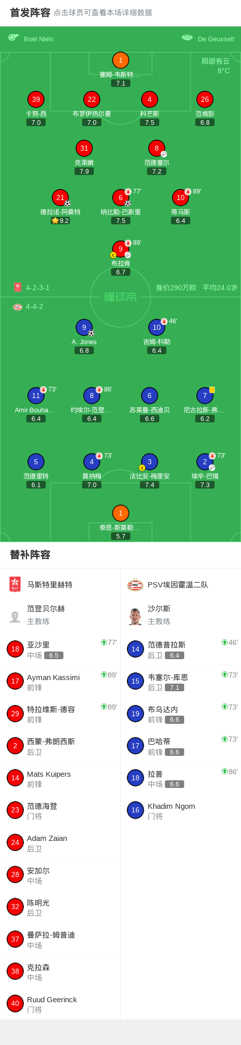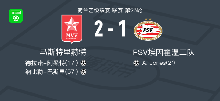 北京时间2月7日荷兰乙级联赛 联赛 第26轮,马斯特里赫特主场对阵PSV埃因霍温二队。马斯特里赫特德拉诺-阿桑特破门,纳比勒-巴斯里破门。PSV埃因霍温二队A. Jones破门。最终比分马斯特里赫特 2-1 PSV埃因霍温二队。