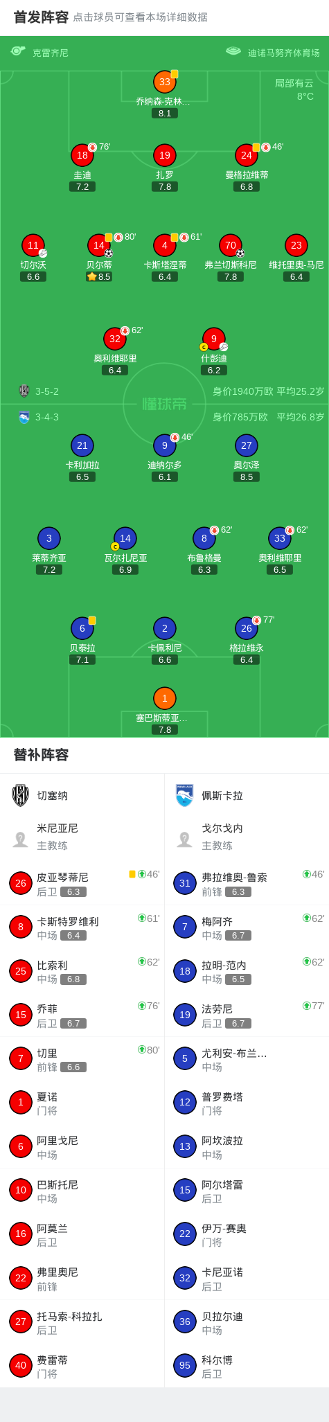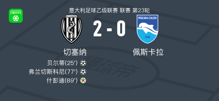北京时间2月7日意大利足球乙级联赛 联赛 第23轮,切塞纳主场对阵佩斯卡拉。切塞纳贝尔蒂破门,弗兰切斯科尼破门。最终比分切塞纳 2-0 佩斯卡拉。