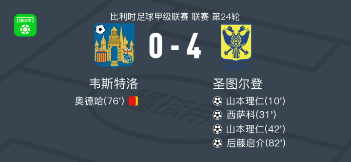北京时间2月7日比利时足球甲级联赛 联赛 第24轮,韦斯特洛主场对阵圣图尔登。圣图尔登山本理仁梅开二度,西萨科破门,后藤启介破门。最终比分韦斯特洛 0-4 圣图尔登。
