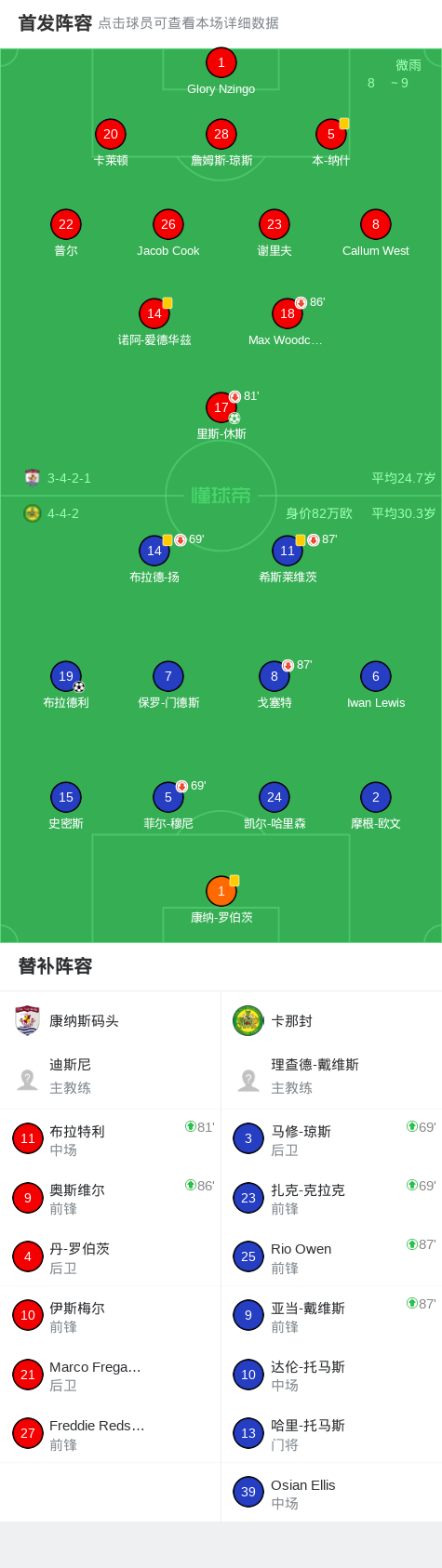 康纳斯码头1-1卡那封,里斯-休斯破门,布拉德利扳平比分