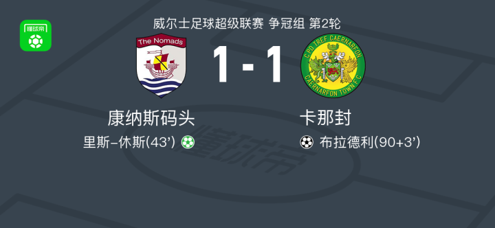 北京时间2月7日威尔士足球超级联赛 争冠组 第2轮,康纳斯码头主场对阵卡那封。康纳斯码头里斯-休斯破门。卡那封布拉德利破门。最终比分康纳斯码头 1-1 卡那封。