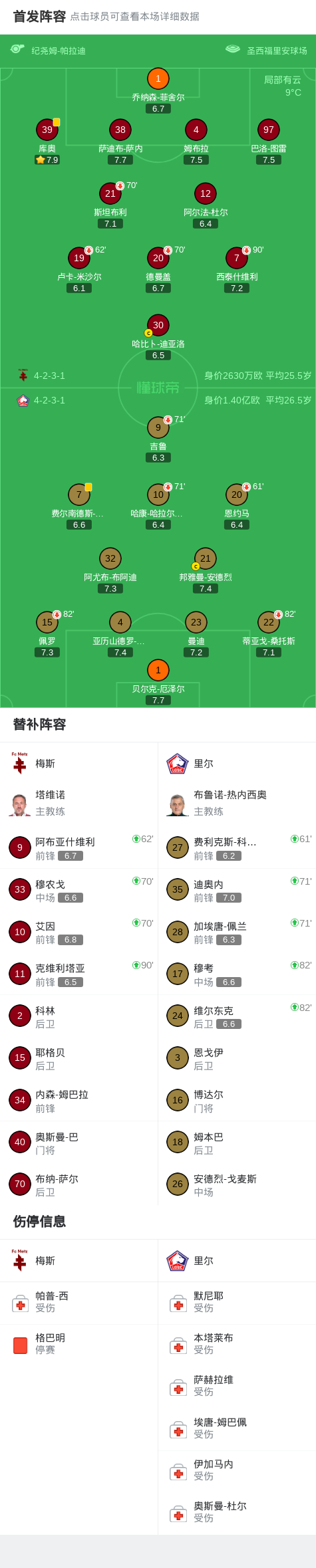 梅斯0-0里尔,秋色平分战报bot @懂球帝02-07 05:45北京时间2月7日,法国足球顶级联赛第21轮展开较量,梅斯坐镇主场迎来里尔的挑战。经过全场比赛的争夺,双方均未能攻破对手球门,最终梅斯0-0战平里尔。点击查看本场比赛详细数据>>点击查看法甲完整积分榜>> 球队阵容 技术统计 展开更多