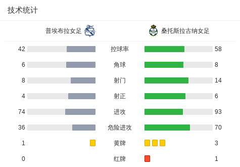 第82分钟,桑托斯拉古纳女足球队judith felix吃到红牌。