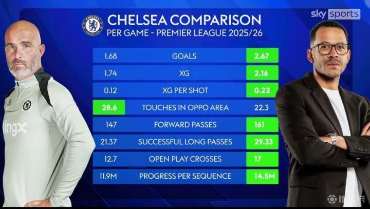 根据天空体育的统计,罗塞尼尔时代的切尔西在本赛季英超联赛中,进球、预期进球、每次射门的预期进球、向前传球、成功长传数、运动战传中、每次序列推进距离*等7项数据优于马雷斯卡时代,仅对方禁区触球数小于马雷斯卡时代。