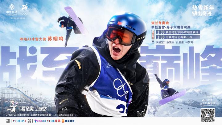 有惊无险!苏翊鸣大跳台预赛稳进,今夜2:30决赛见真章! 咪咕体育 咪咕体育2026-02-07 18:062月6日,在刚刚结束的米兰-科尔蒂纳冬奥会单板滑雪男子大跳台预赛中,中国小将苏翊鸣以一记高质量内转1980成功落地,最终总分172.75分晋级决赛!今晚2点30分,真正的决战即将打响!作为中国队冲金焦点,咪咕AI冰雪大使——苏翊鸣将在米兰冬奥会单板滑雪大跳台向金牌发起冲击。这场巅峰对决,注定火花四溅。想看苏翊鸣如何挑战极限、绽放冰雪光芒?锁定咪咕体育联合直播,扫描海报二维码直达赛场,我们一起见证历史!展开更多