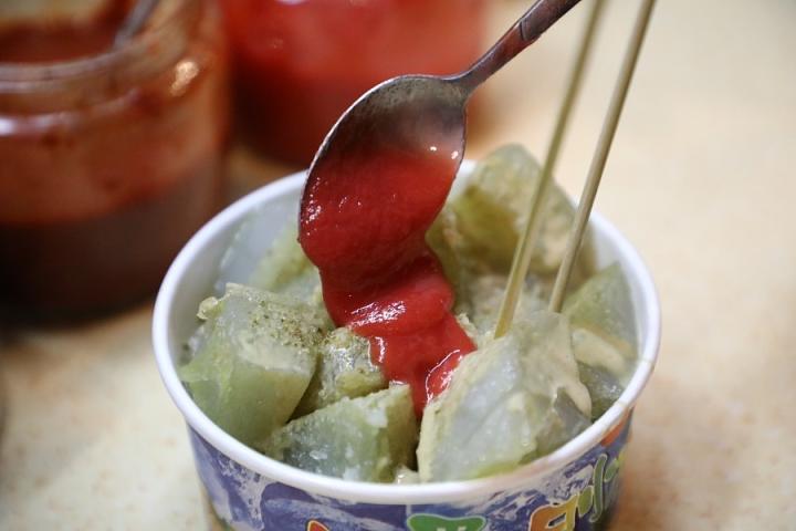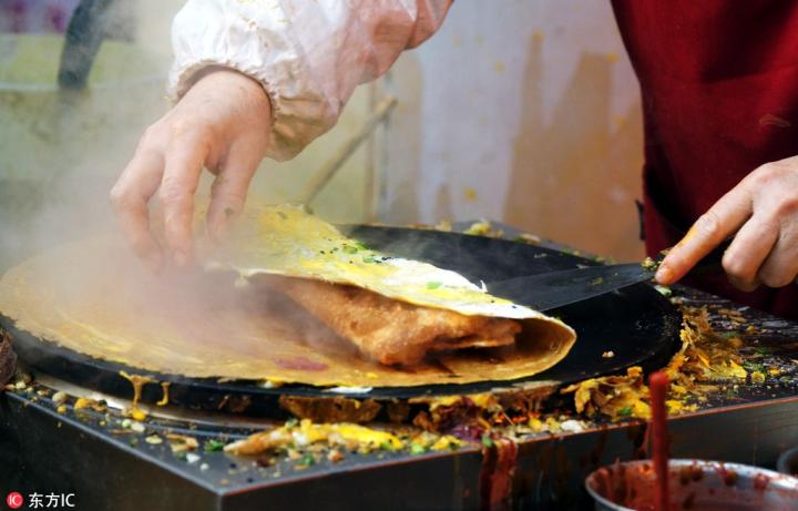 摊开的煎饼上打上一两个鸡蛋,刷上咸香的酱料,卷上馃子,就成了一道方便、美味的早餐。面糊的原料多种多样,除了最常见的白面糊,还有绿豆面、玉米面等材料。各家的酱料也不一样,有甜面酱、辣椒酱、腐乳等等,口味千变万化。点煎饼馃子的时候,放不放葱,可要提前和师傅打好招呼。