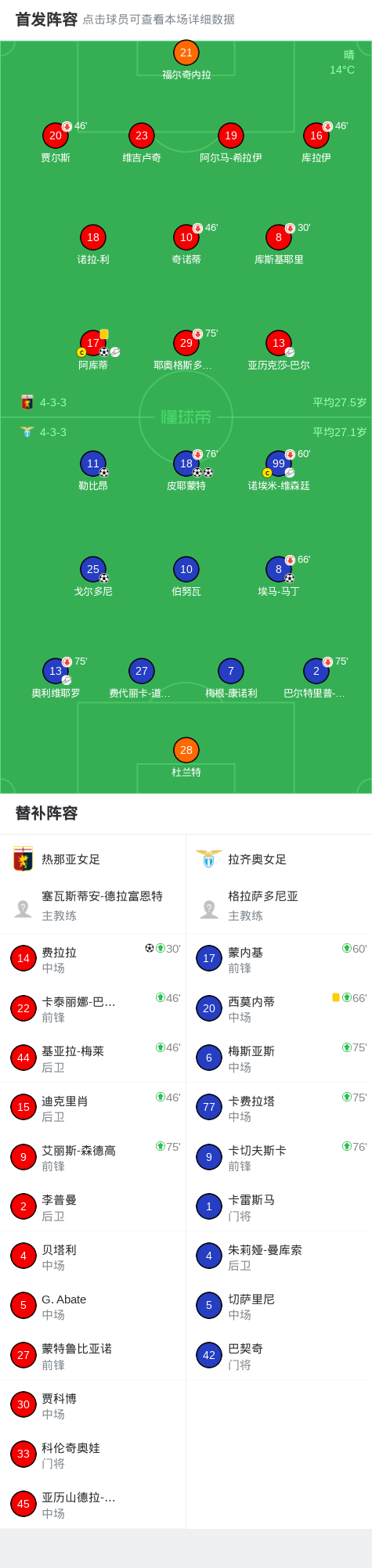 上半场补时第2分钟,热那亚女足球员阿库蒂助攻费拉拉打入一球。