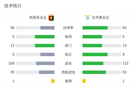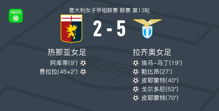 北京时间2月7日意大利女子甲组联赛 联赛 第13轮,热那亚女足主场对阵拉齐奥女足。热那亚女足阿库蒂破门,费拉拉破门。拉齐奥女足埃马-马丁破门,勒比昂破门,皮耶蒙特梅开二度,戈尔多尼破门。最终比分热那亚女足 2-5 拉齐奥女足。