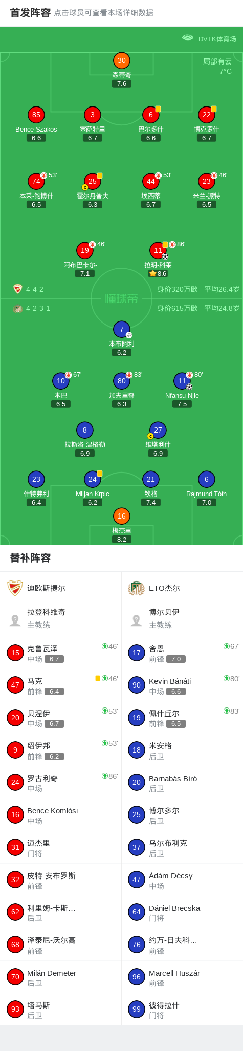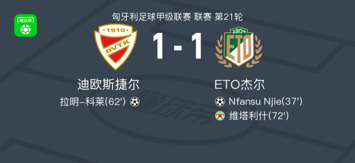 北京时间2月7日匈牙利足球甲级联赛 联赛 第21轮,迪欧斯捷尔主场对阵ETO杰尔。迪欧斯捷尔拉明-科莱破门。ETO杰尔Nfansu Njie破门。最终比分迪欧斯捷尔 1-1 ETO杰尔。