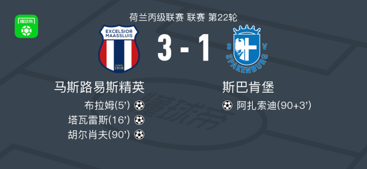 北京时间2月7日荷兰丙级联赛 联赛 第22轮,马斯路易斯精英主场对阵斯巴肯堡。马斯路易斯精英布拉姆破门,塔瓦雷斯破门,胡尔肖夫破门。斯巴肯堡阿扎索迪破门。最终比分马斯路易斯精英 3-1 斯巴肯堡。
