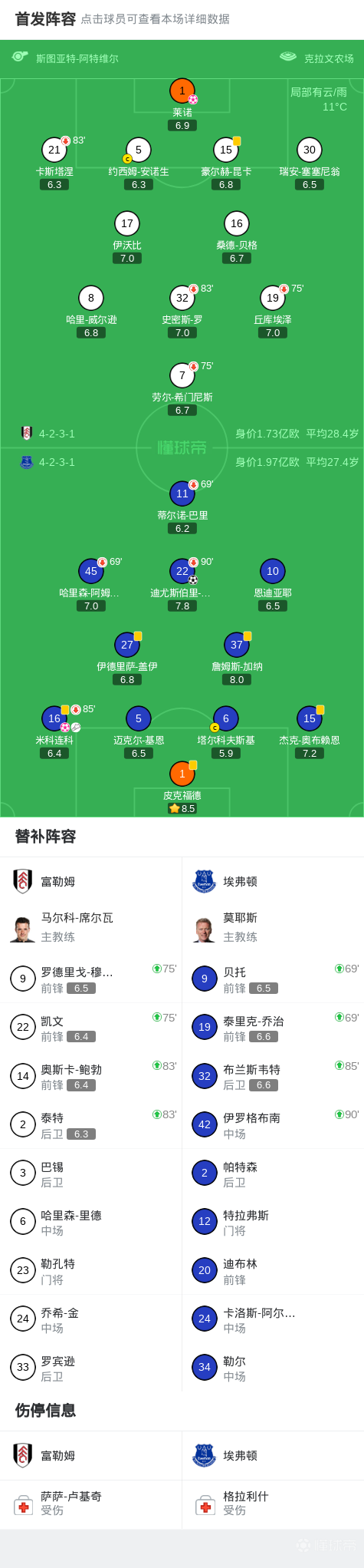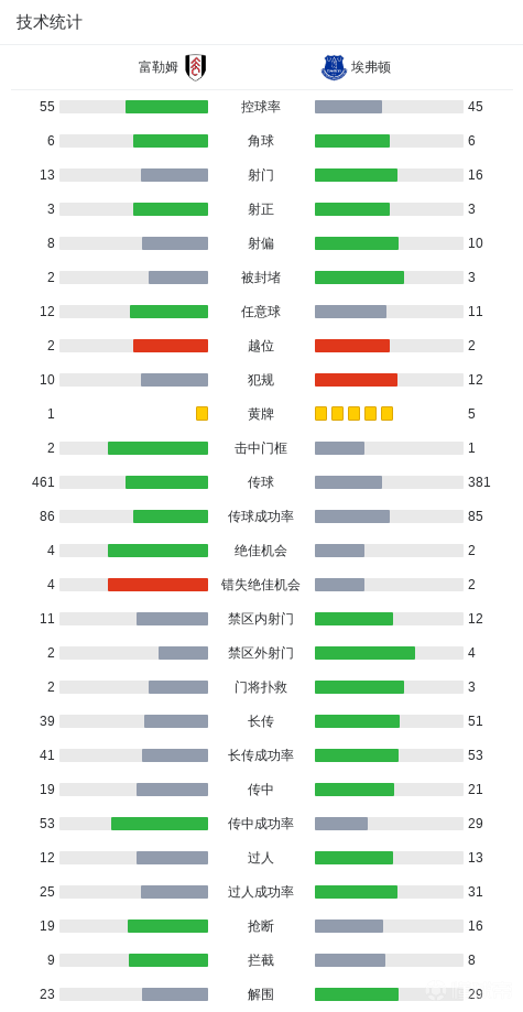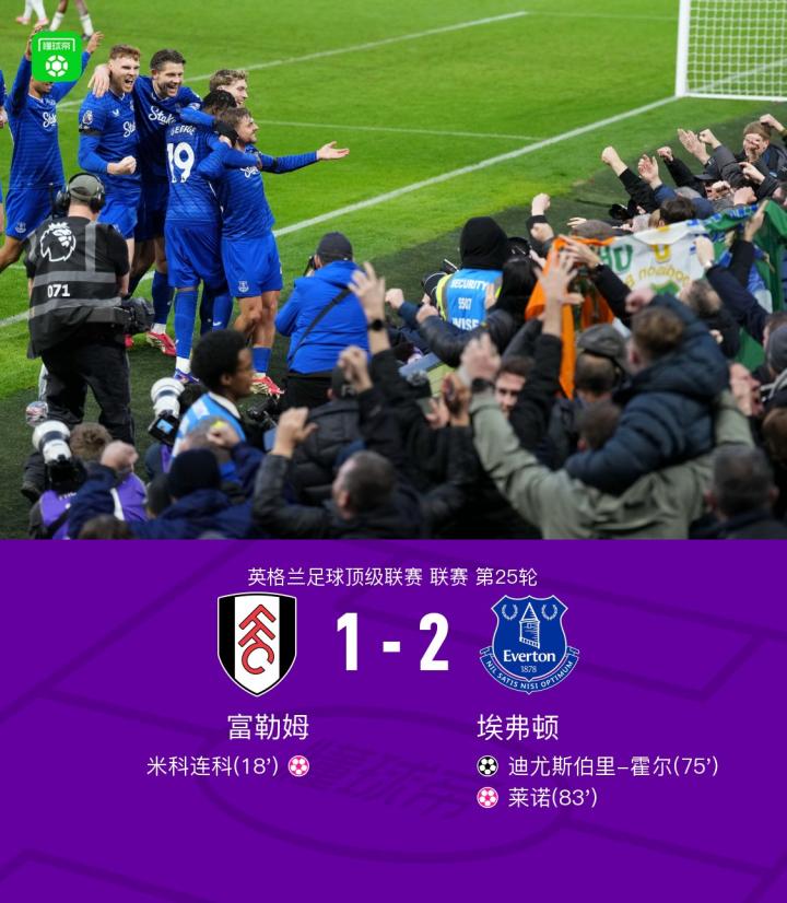 埃弗顿2-1逆转富勒姆,霍尔建功,米科连科、莱诺乌龙