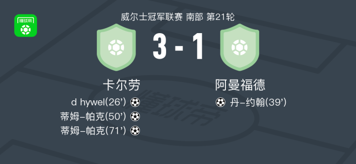 北京时间2月8日威尔士冠军联赛 南部 第21轮,卡尔劳对阵阿曼福德。卡尔劳d hywel破门,蒂姆-帕克梅开二度。阿曼福德丹-约翰破门。最终比分卡尔劳 3-1 阿曼福德。